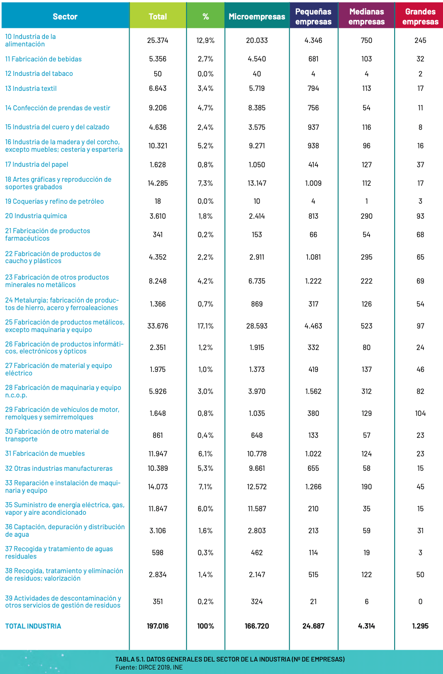 Centrándonos en el epígrafe Industrial, según el INE, en 2019 había 197.016 empresas del sector Industria en España, donde el 84,6% son microempresas (muchas auxiliares) que tienen entre 0 y 9 empleados, las pymes casi un 15% y las grandes empresas un 0,7%. La fabricación de productos metálicos (exceptuando maquinaria y equipos) lidera los subsegmentos con un 17,1% seguido de la industria alimentaria con un 12,9%. Del resto ninguno supera el 7,3%