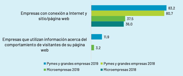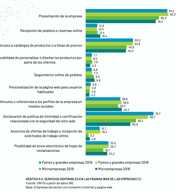 Un dato que me llama mucho la atención es que, según el estudio, en 2019 había casi un 17% de Pymes y Grandes empresas que no tienen página web, es decir que son invisibles digitalmente. Si nos vamos a Microempresas el índice alcanza el 62,5% sin página web.