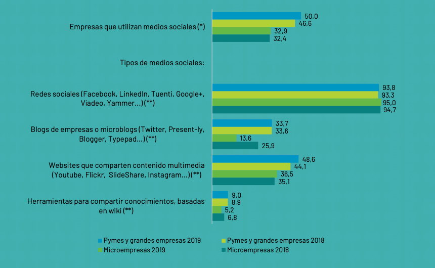 las empresas del sector de la industria, siendo los porcentajes en ambos segmentos empresariales superiores al 93%. No obstante, gana popularidad la utilización de websites para compartir contenido multimedia, sobre todo entre las microempresas, habiendo crecido desde 2016 en 16,9 puntos porcentuales (36,5% en 2019). En el caso de las pymes y grandes empresas este porcentaje solo ha aumentado en 3,5 p.p. (48,6% en 2019) en el referido periodo.
