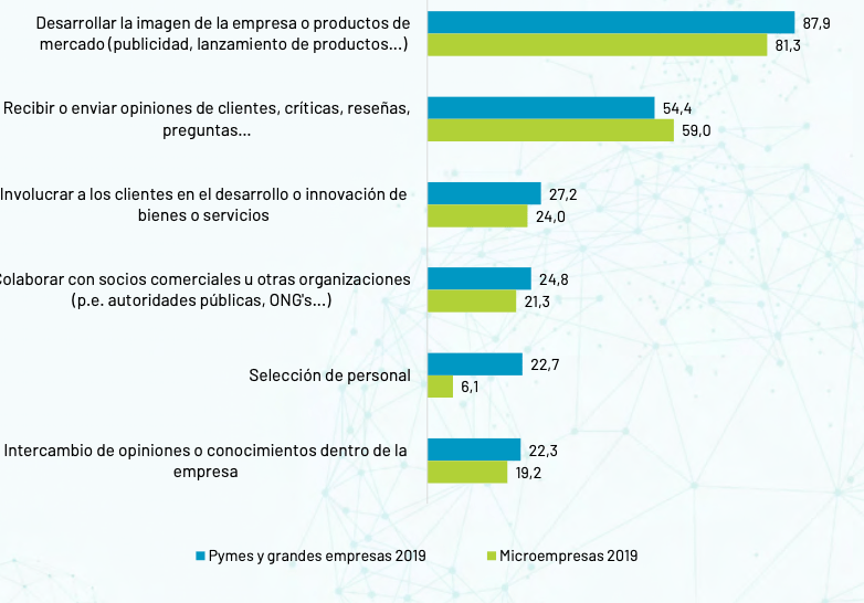 Con respecto a los motivos por los que las empresas del sector utilizan medios sociales, los principales son para desarrollar la imagen de las empresas o productos de mercado y para recibir o enviar opiniones de clientes, más utilizado, en este caso, por las microempresas (59%) que por las de 10 o más empleados (54,4%), en 2019.