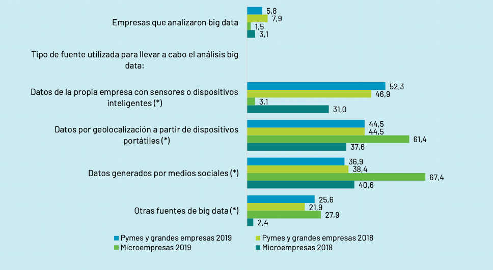 Distinguiendo según los tipos de fuentes utilizadas para efectuar el análisis de big data, se observa un comportamiento diferencial entre segmentos empresariales