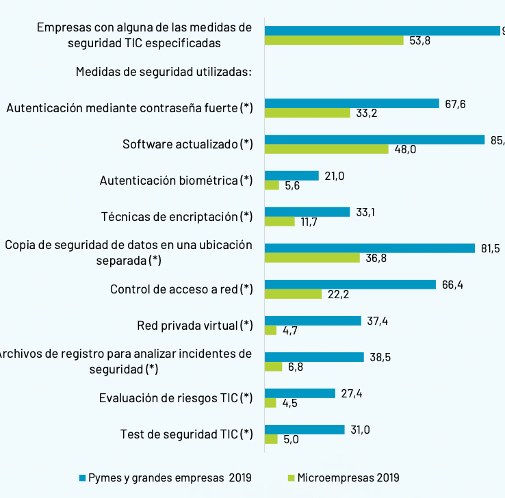 Casi la totalidad de pymes y grandes empresas (90%) han tomado medidas a nivel ciberseguridad, en microempresas cae hasta el 50%. A nivel general, las medidas en materia de ciberseguridad más populares entre las empresas del sector son el mantenimiento actualizado del software, la realización de copias de seguridad de datos en ubicación separada, la autenticación mediante contraseña fuerte y el control de acceso a red.