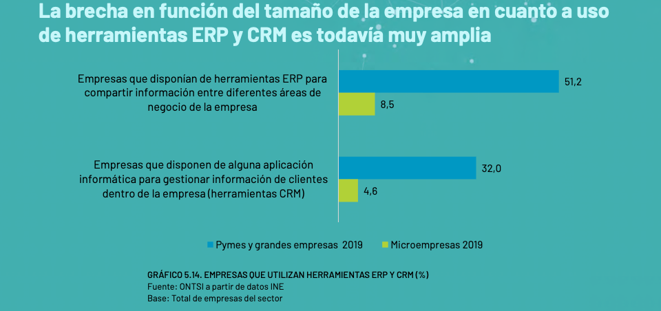 En 2019, más de la mitad de las pymes y grandes compañías industriales (51,2%) utilizan herramientas para compartir información entre sus diferentes áreas de negocio (herramientas ERP). En el caso de las microempresas el dato disminuye a tan solo un 8,5% de usuarias.