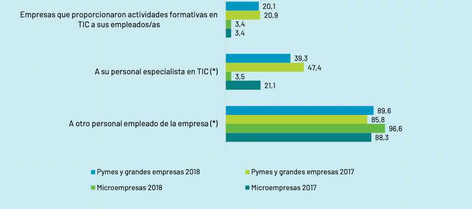 En 2019, la brecha entre ambos segmentos empresariales de la industria se mantiene en casi 17 puntos porcentuales. La gran mayoría de las que proporcionan formación TIC la dirigen a otro personal empleado, en lugar de a su personal especialista en TIC.