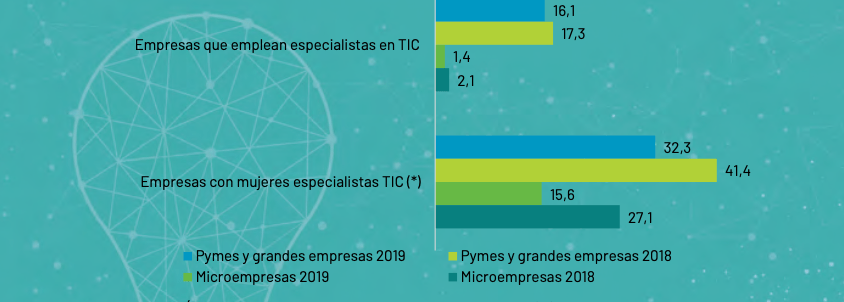 La misma tendencia se observa con respecto a las empresas que cuentan con mujeres especialistas en TIC en ambos segmentos empresariales.