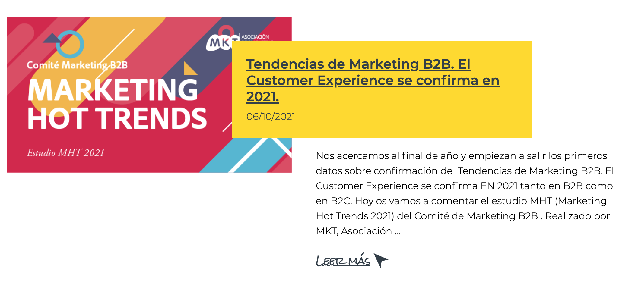 Esto lo habéis podido entender muy claramente en el artículo que comparte y comenta unas tendencias del Marketing B2B muy enfocadas hacia el Customer Experience y que ilustró el estudio MHT (Marketing Hot Trends 2021) del Comité de Marketing B2B de la Asociación de Marketing de España