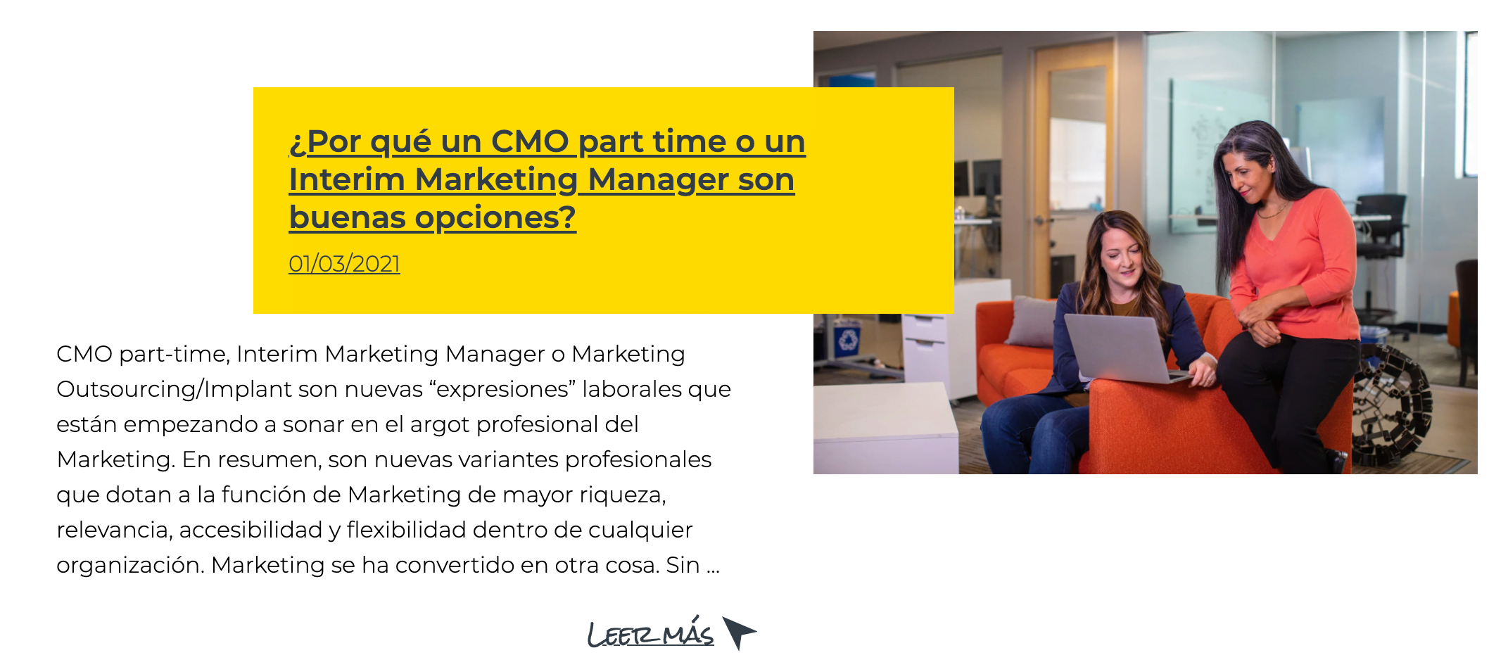 Desde nuestra experiencia profesional como  interim Marketing Directors o CMO part-time   complementando a los equipos de Marketing internos pero compartiendo sus objetivos os hemos hablado en «porque un CMO part time son buenas opciones»  y en «9 ideas sobre como poner en marcha tu departamento de marketing y ventas industrial.»