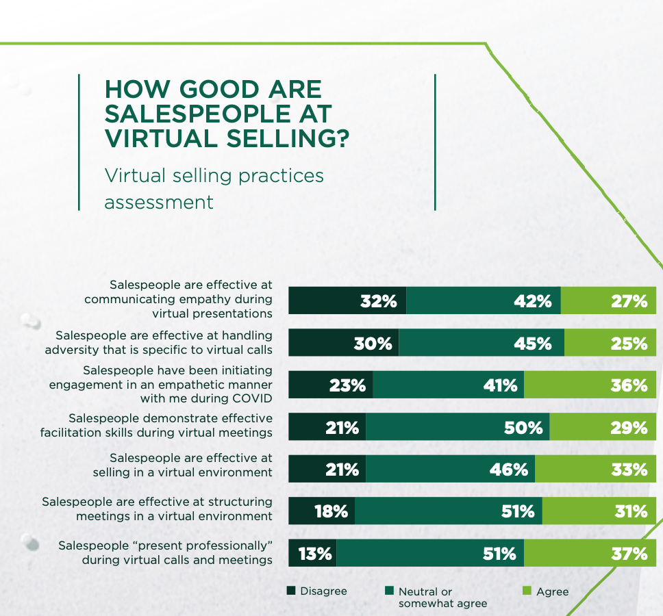 En un reciente estudio (de la consultora Korn Ferry) entre diferentes compradores americanos, se arrojaba la conclusión de que, a ojos de las empresas compradoras americanas, sólo el 33% de los vendedores eran efectivos en un entorno virtual.