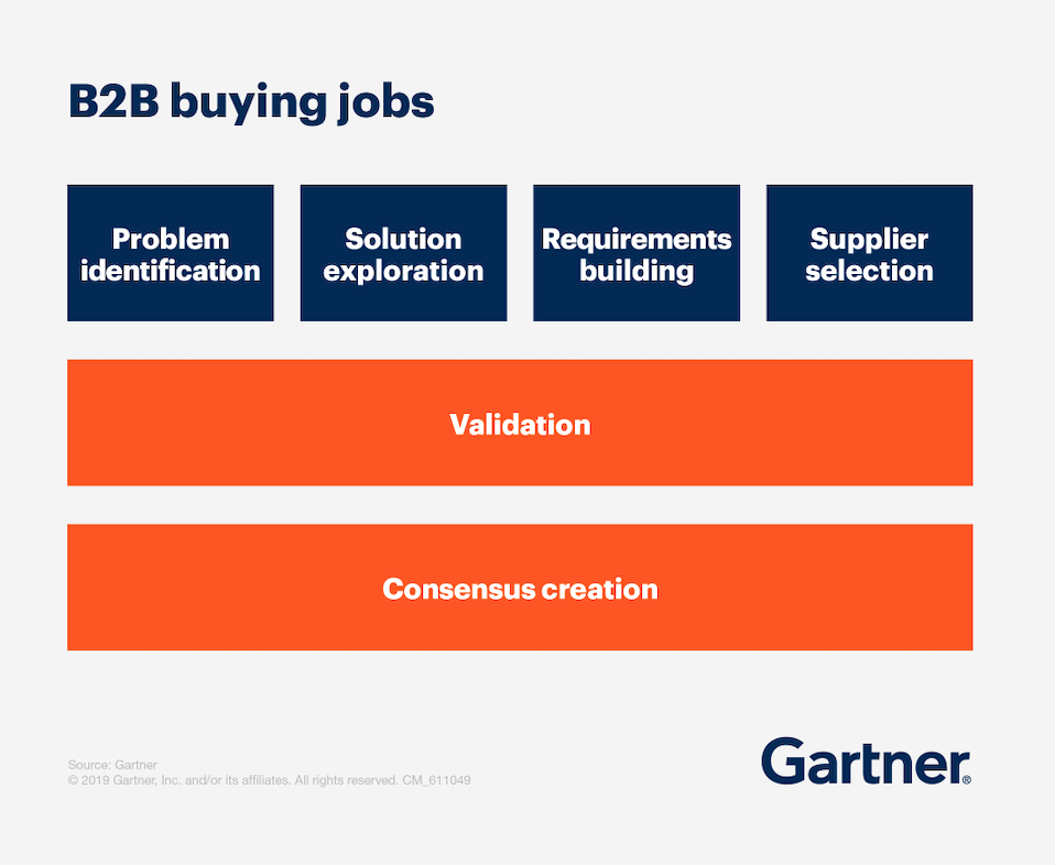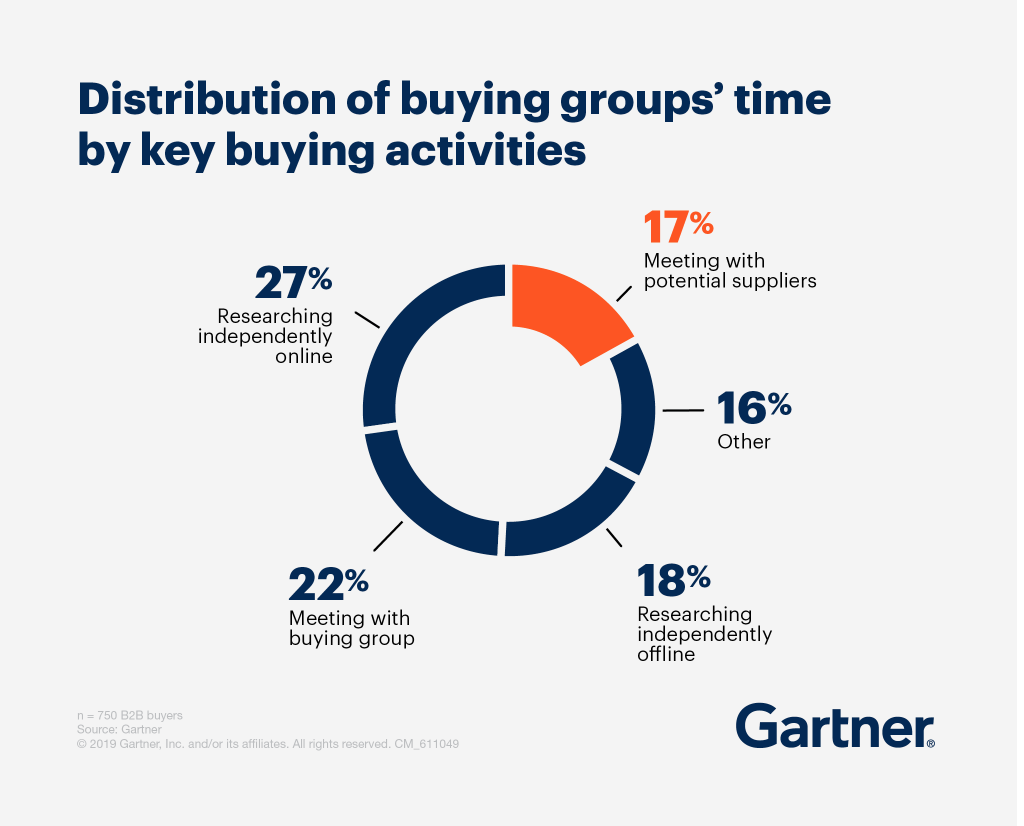 Cómo vemos en el gráfico de Gartner de abajo, dedica ya más tiempo a buscar de forma independiente (27% online+18% offline) que a «sentarse» con vendedores B2B (17%).
