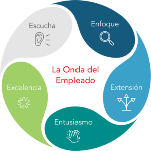 Por ejemplo, la asociación DEC ha desarrollado su propio modelo práctico de gestión llamado la onda del empleado (gráfico inferior) donde se controlan y diseñan las vivencias del empleado para comprender y activar una mejor Experiencia de empleado.