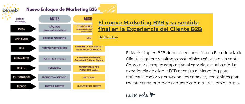 Es por ello que el sentido estratégico del Marketing B2B para PYMES está cada vez más centrado ya no en crear relaciones y sí en impactar en la experiencia que el cliente siente recibir.