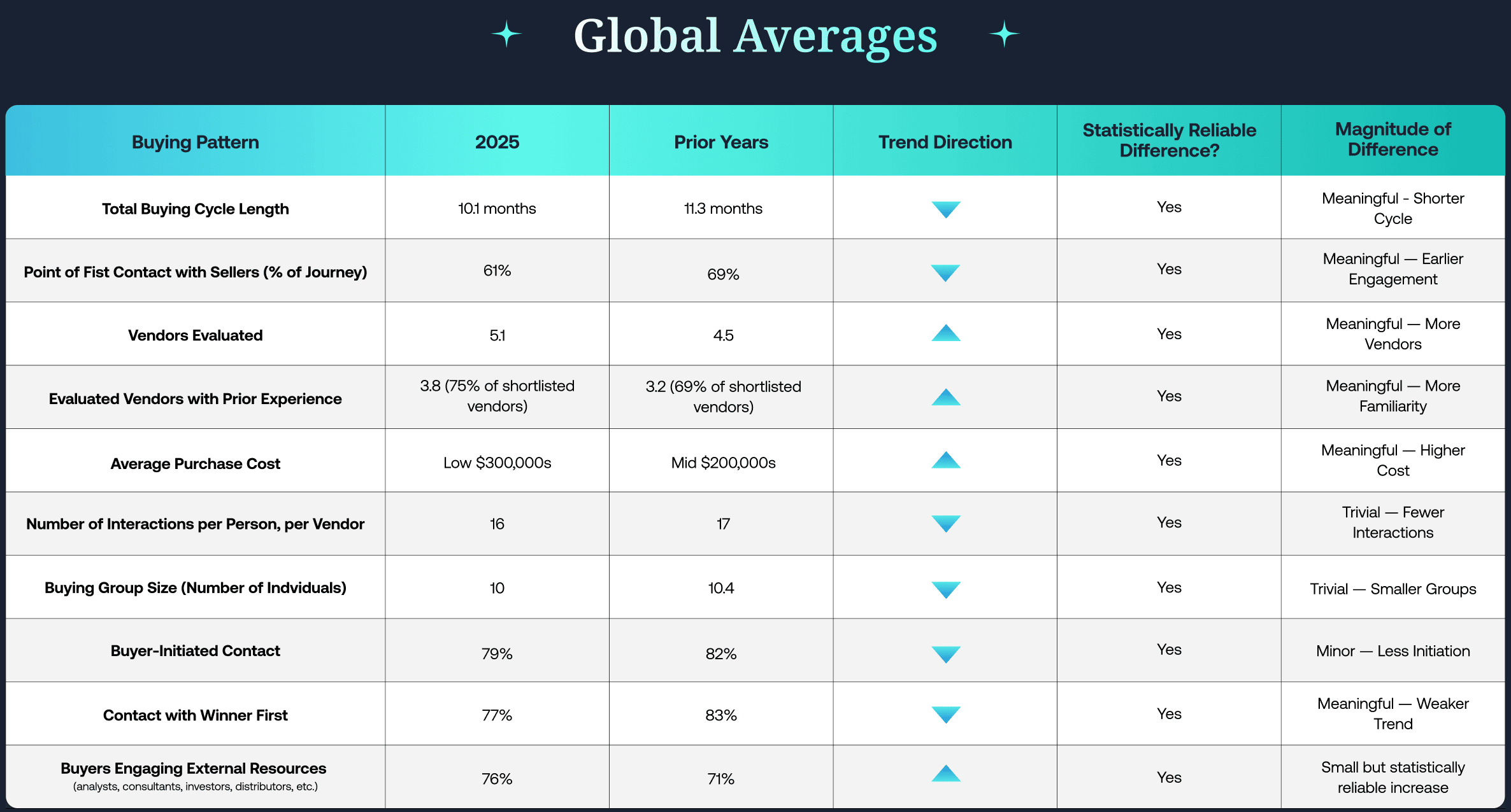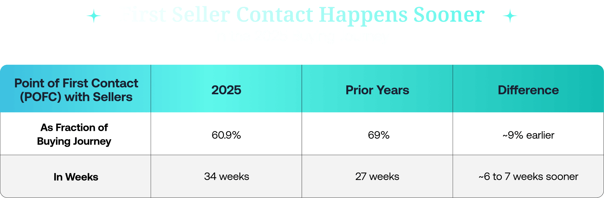 Según el estudio de la plataforma el primer contacto de los compradores con los vendedores pasó de surgir cuando aproximadamente el 69 % del proceso de compra ya se había producido en 2024 y 2023 al 61 % en 2025.