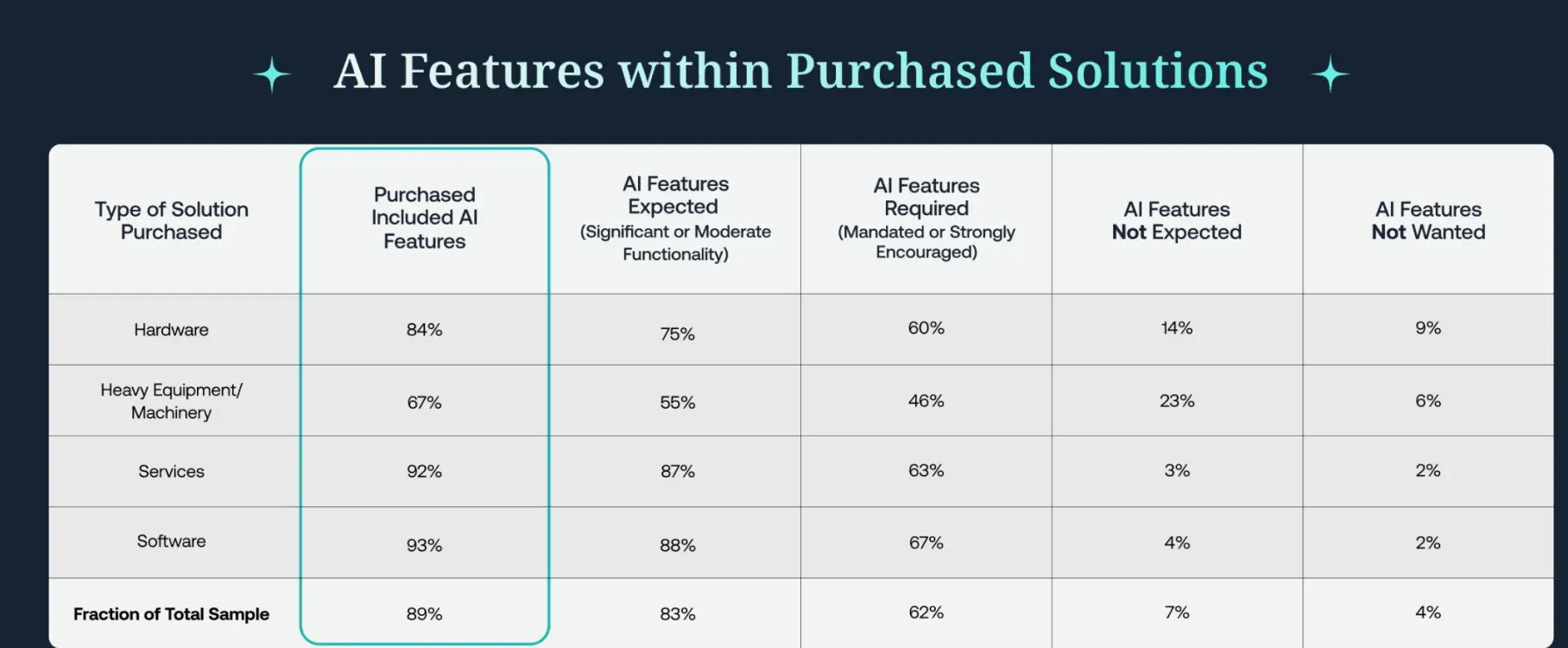 Igualmente, me parece interesante este cuadro inferior que detalla, a qué nivel (se espera, se exige, no se necesita etc.) se espera la integración de la IA en la solución final escogida por sectores (software, hardware, maquinaria y servicios).