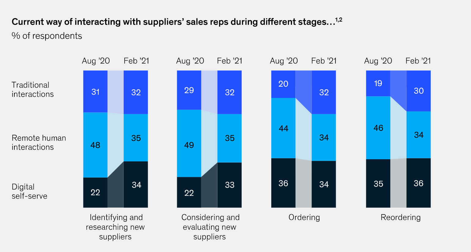 Esto lo vemos en los datos del estudio. Comparando Agosto de 2020 y Febrero de 2021 vemos en que en la búsqueda de nuevos proveedores y la consideración y evaluación de los mismos , en ambos su intensidad en el canal e-commerce ha crecido un 10%. Por otro lado los 3 canales tienen una importancia parecida.