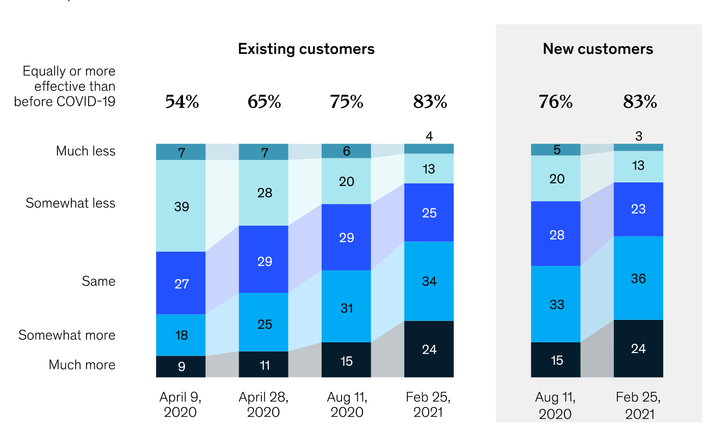 De un 9% (arriba) que admitían que la omnicanalidad B2B era más efectiva para mantener clientes en Agosto 2020 hemos pasado a un 24% en Febrero 2021 al igual que para captar nuevos clientes donde hemos pasado de 15% a 24% entre agosto y febrero. Estos datos dejan claro que la omnicanalidad ya no se ve como una medida de urgencia y sí se están sabiendo entender las ventajas de forma indefinida..